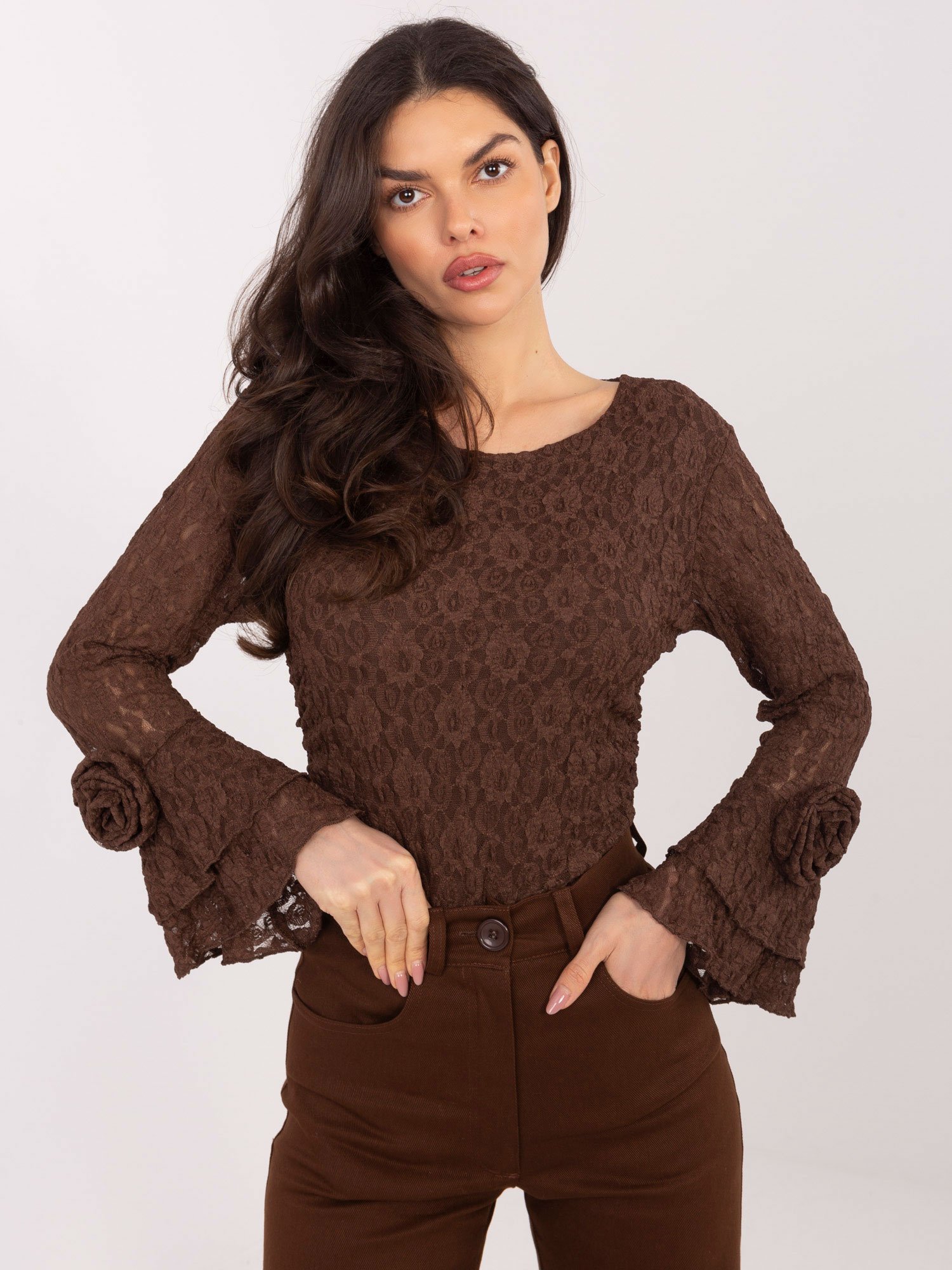 Esta blusa de encaje destaca por su feminidad y sus detalles delicados. El encaje, ligeramente ajustado, crea una silueta elegante, mientras que las rosas decorativas en los puños acampanados aportan un toque especial y un encanto sofisticado. Una prenda versátil que combina igual de bien con pantalones clásicos, de efecto piel o con falda, perfecta tanto para looks de noche como para elevar un estilismo de diario.