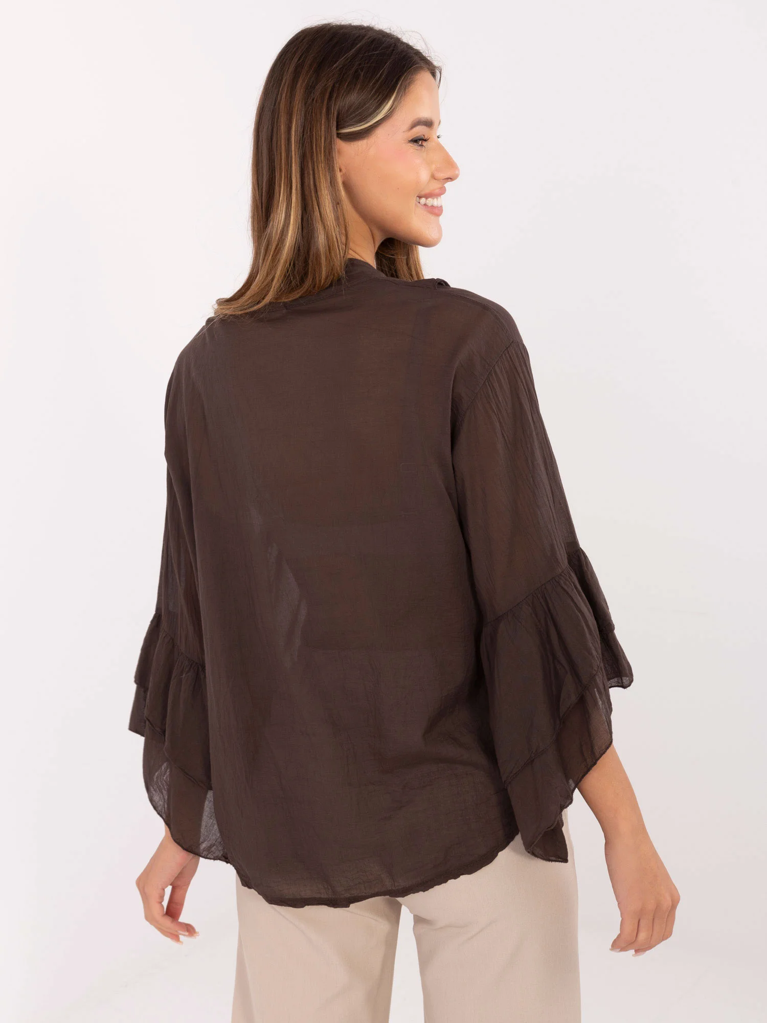 Camisa elegante de algodón de corte oversize, diseñada para adaptarse a diferentes tipos de figura y estilos. El tejido ligero y fluido cae suavemente, ayudando a disimular imperfecciones y proporcionando una sensación de comodidad durante todo el día. Los delicados volantes aportan un toque femenino y sofisticado, mientras que el diseño amplio añade ligereza y movimiento a la prenda. Un modelo versátil, perfecto tanto para looks elegantes como para combinaciones más relajadas.