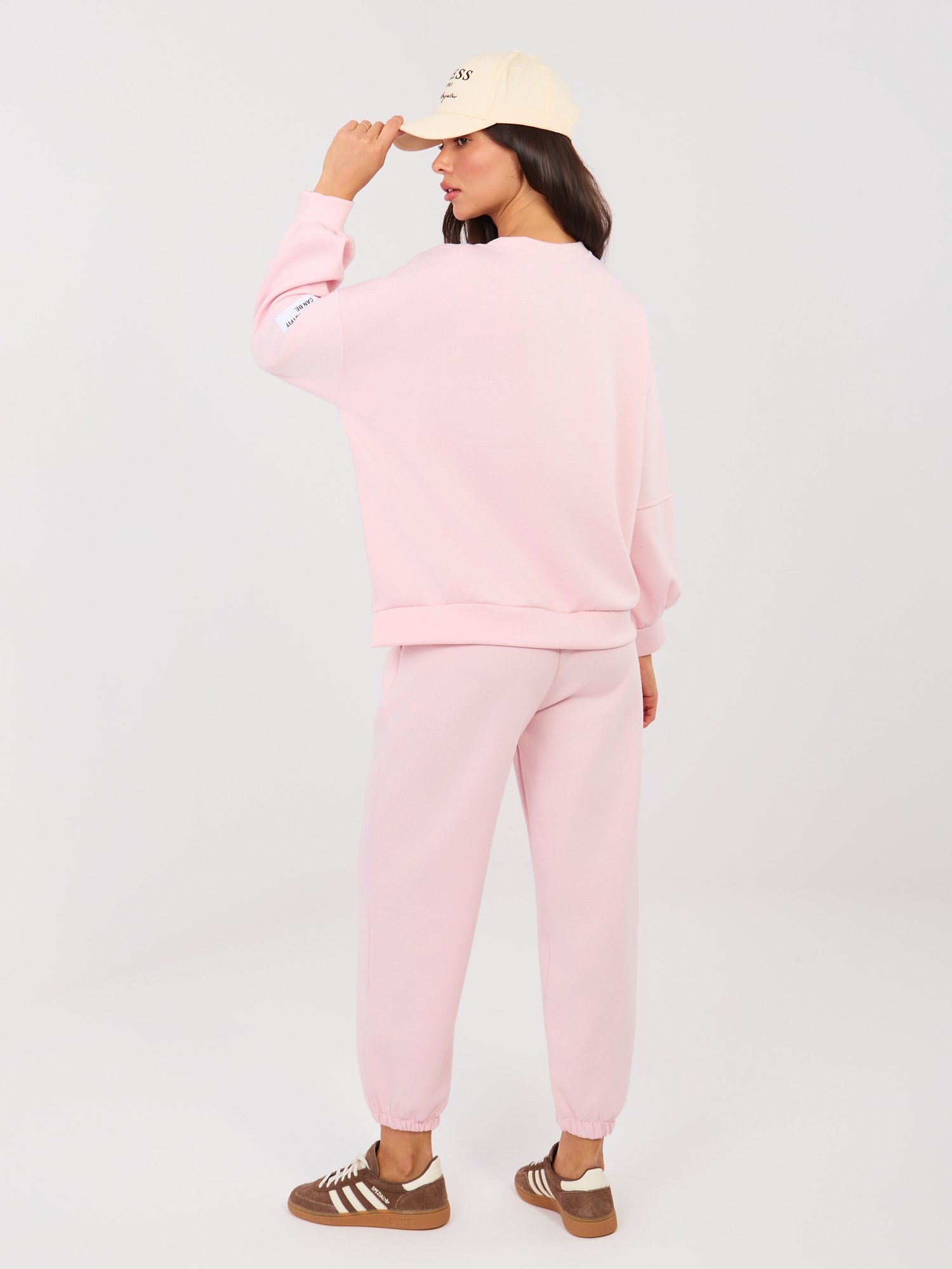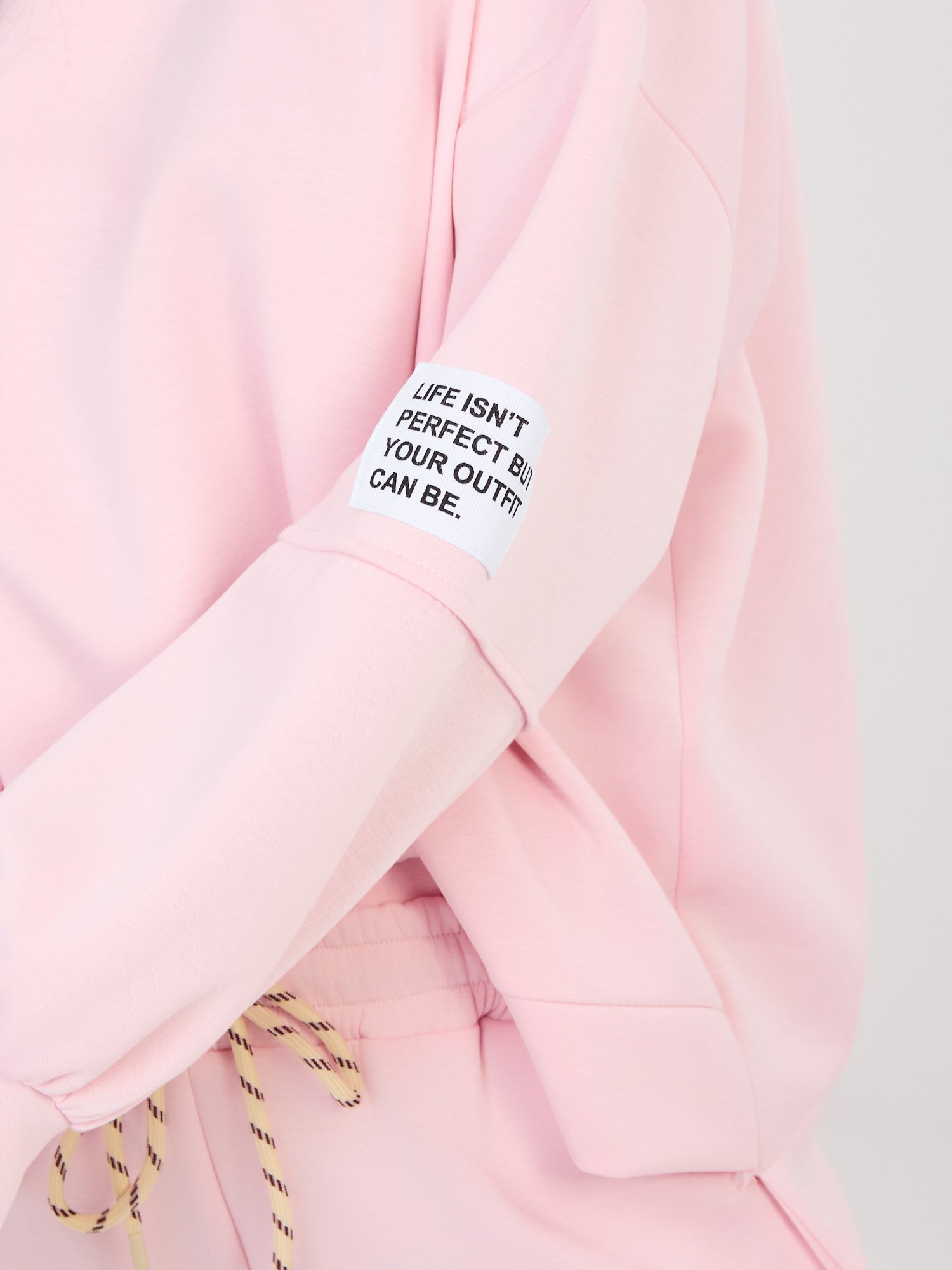 Conjunto casual compuesto por sudadera y pantalón, confeccionado en un tejido suave, agradable al tacto y ligeramente elástico. La manga de la sudadera está decorada con una aplicación de texto minimalista que aporta un toque sutil y distintivo al diseño. Ideal para el día a día y momentos de relax.