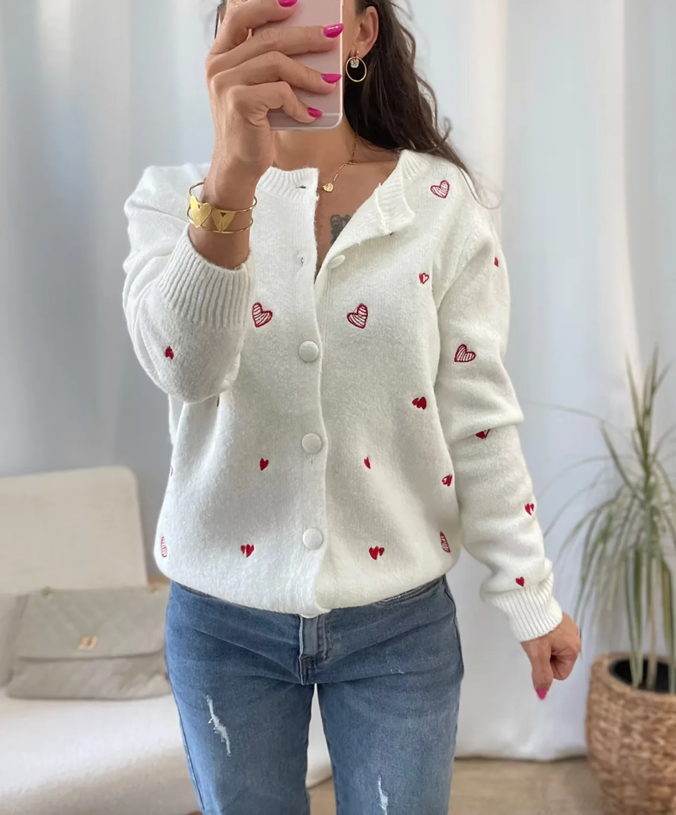 Cárdigan de tacto suave y agradable, decorado con delicados corazones bordados que aportan un toque femenino y romántico. El diseño clásico con botones permite llevarlo tanto cerrado como abierto, adaptándose fácilmente a diferentes estilos y ocasiones. Una prenda cómoda y versátil, perfecta para looks de diario, combinaciones casuales o conjuntos más delicados.