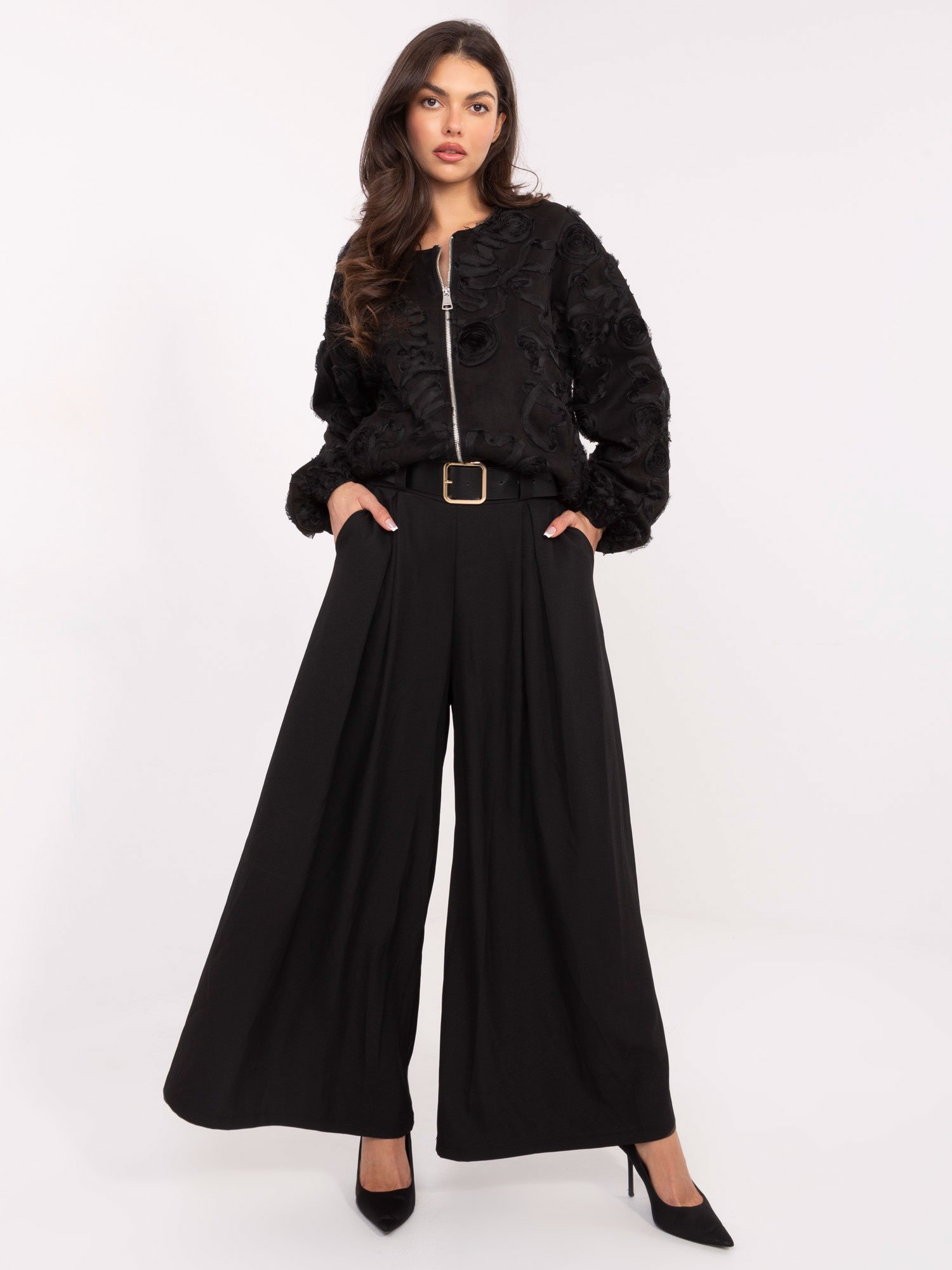 Las medidas de la modelo son: altura 173 cm, pecho 85 cm, cintura 62 cm, caderas 94 cm.