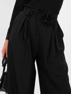 Pantalones de corte clásico y pernera ancha con talle alto. Su caída fluida que estiliza la silueta y aporta comodidad durante todo el día. El detalle en la cintura realza la figura y permite crear un look completo sin necesidad de accesorios adicionales. Un modelo versátil, ideal tanto para conjuntos elegantes como para el día a día.