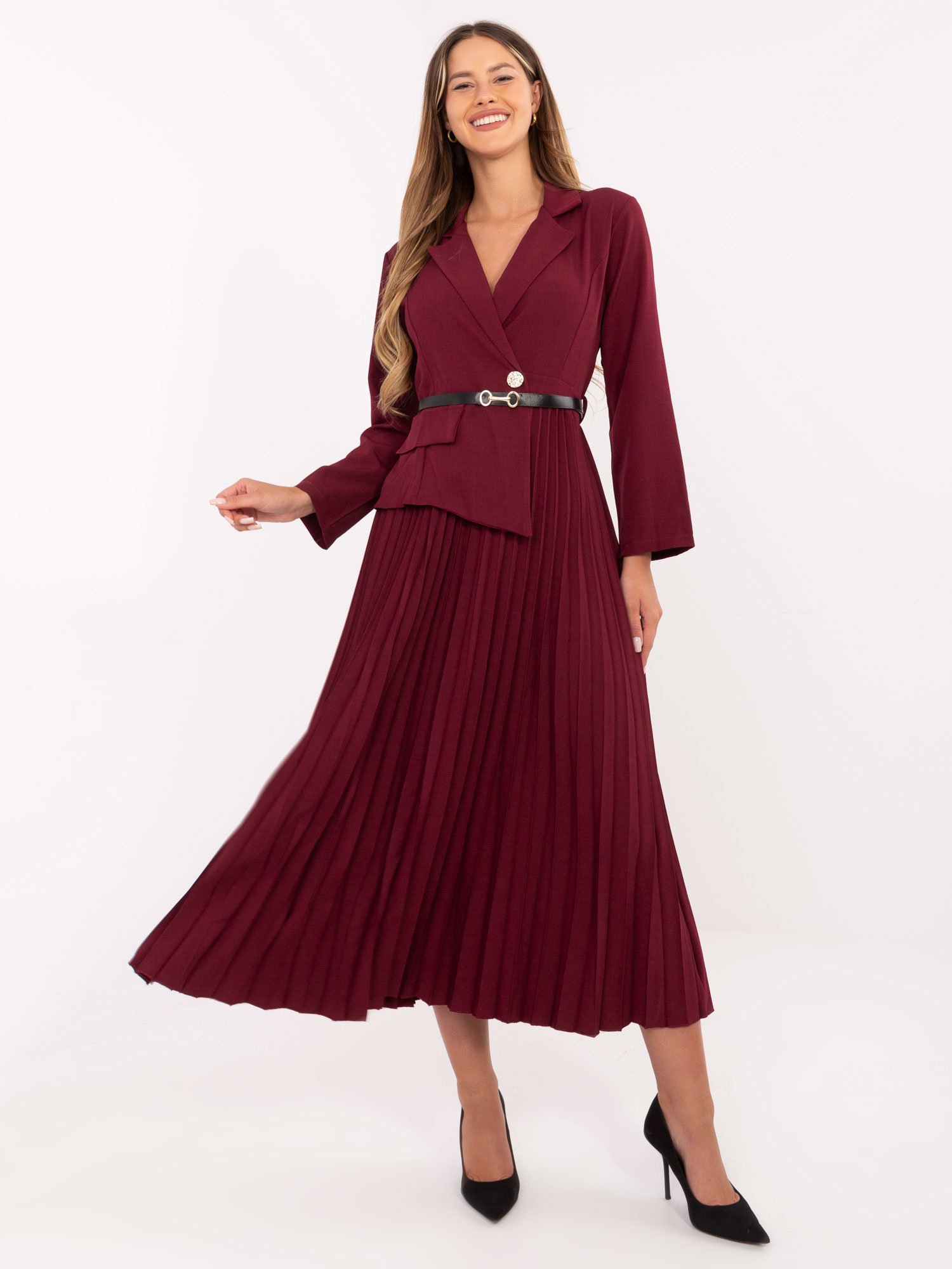 Vestido tipo blazer con falda plisada y cinturón desmontable CATALINA – burdeos